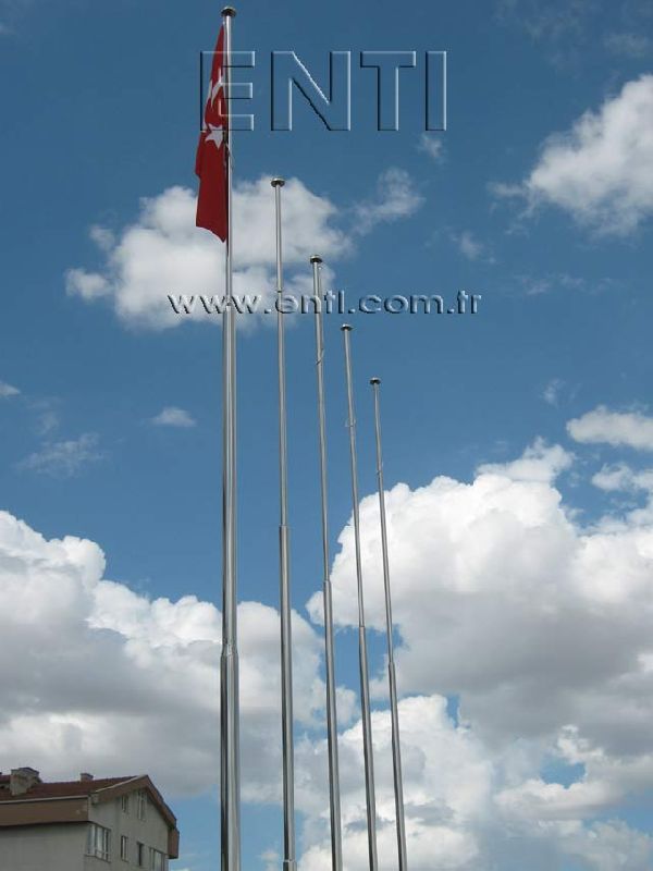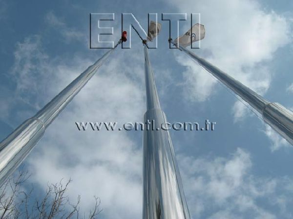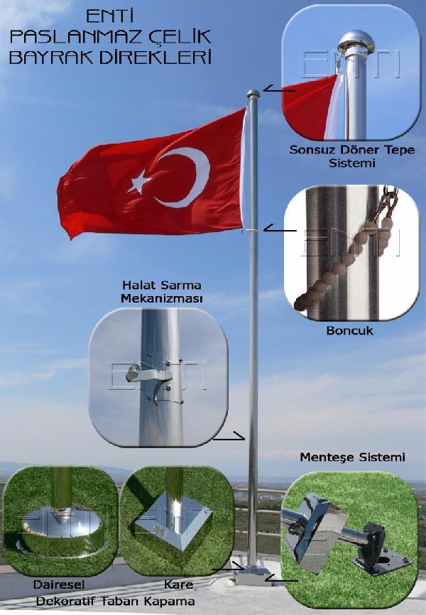 Paslanmaz çelik bayrak direkleri, AISI 304 kalite paslanmaz borudan imal edilmektedir. Boruların birleşiminde özel imalat paslanmaz redüksiyon kullanılmaktadır. Paslanmaz bayrak direk lerimizde standard olarak; 360 derece dönebilen sonsuz döner tepe sistemi, Enti Mühendisliğin patentli tasarımı olan bayrak sarma tamburu (ırgat), AISI 304 kalite paslanmazdan imal edilen taban flanşı kapama rozeti ve menteşeli taban flanşı bulunmaktadır (9 mt ye kadar). Paslanmaz direkler müşterinin isteği doğrultusunda; bünyemizde bulunan polisaj imalatanesinde parlak veya satine olarak polisajlanır. Standard olarak 3mt. İla 13mt üretilen paslanmaz bayrak direkleri özel üretim olarak 80 mt kadar poligonal olarakta üretilmektedir. Krom bayrak direği. Stainless steel flagpole production by ENTI.